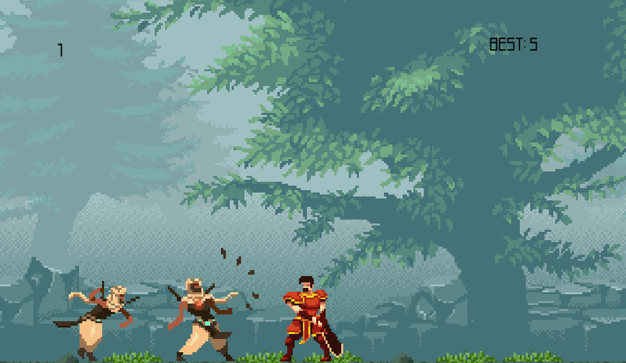 There are enemies spawning from both sides of the screen and you have to time your attacks to defeat them. As you defeat enemies, they spawn faster, but your sword swings also get faster.